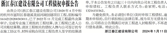由我公司(浙江春江建设有限公司)2020年4月中标的杭州市富阳区春建溪美丽河湖创建项目工程,招标编号16142120200303011,已于2022年11月完成工程最终决算审计,完成专业施工班组的工程结算,该工程现已进入公司关账结算期,请该工程相关的债权人携与公司签订的专业施工协议书、材料采购合同及工程负责人签字的结算清单,于本公告发布之日起三十日内向我公司本工程负责人申报债权。工程负责人联系方式为:俞家明,电话:13216151562。