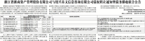 根据浙江省浙商资产管理股份有限公司与绍兴帛文信息咨询有限公司签署的《债权转让协议》(协议编号01ZX2022030-7),浙江省浙商资产管理股份有限公司已将其对下列借款人及其担保人项下享有的全部权利(包括但不限于主债权、担保债权、违约金债权、利息债权、损失赔偿权)依法转让给绍兴帛文信息咨询有限公司。浙江省浙商资产管理股份有限公司与绍兴帛文信息咨询有限公司联合公告通知各借款人及担保人以及其他相关各方。
