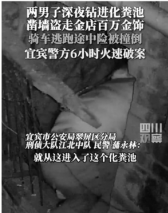 近日,四川宜宾发生一起黄金盗窃案。两个嫌疑人在踩点过程中发现,可以从金店外围钻入一个化粪池,再凿墙就能进入店内。随后,嫌疑人钻洞凿墙进入店内,盗取各类黄金饰品500余件,价值约127万元。宜宾翠屏警方巡线追踪,仅用6个小时,便将被盗财物追回。