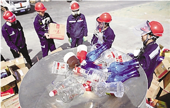 | 工作人员在对假冒白酒进行无害化销毁。资料照片 |