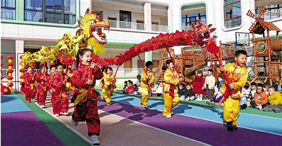 1月18日,仙居县迎晖幼儿园的小朋友在老师指导下,学习舞龙表演。近年来,幼儿园把传统的舞龙文化融入幼儿教育课程,让孩子们在快乐学习的同时,感受传统文化的魅力。
