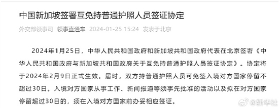 1月25日,中华人民共和国政府和新加坡共和国政府代表在北京签署《中华人民共和国政府与新加坡共和国政府关于互免持普通护照人员签证协定》。协定将于2024年2月9日正式生效。届时,双方持普通护照人员可免签入境对方国家停留不超过30日。入境对方国家从事工作、新闻报道等须事先批准的活动以及拟在对方国家停留超过30日的,须在入境对方国家前办妥相应签证。