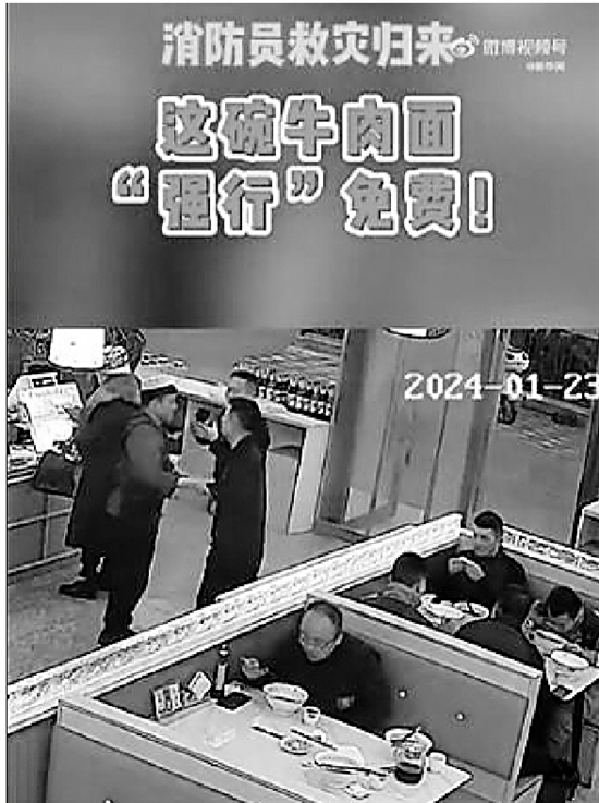 新疆阿克苏地区乌什县发生7.1级地震后,部分参与救援的消防救援人员从救灾现场返回,在当地一家牛肉面馆吃饭,餐后付款时却被店长拦下“强行”免费。店长表示,看到消防员救援人员第一时间奔赴现场救助百姓的消息,心里非常感动,这碗牛肉面只是他的一点点心意。
