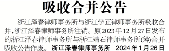 浙江泽春律师事务所与浙江学正律师事务所吸收合并,浙江泽春律师事务所注销。原2023年12月27日发布的浙江泽春律师事务所与浙江靖石律师事务所(筹)合并吸收公告作废。 浙江泽春律师事务所 2024年1月26日