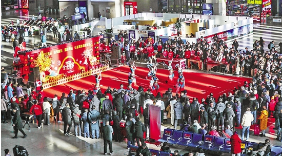 | 1月26日,旅客在沈阳站站内观看文艺演出。新华社记者 潘昱龙 摄 |