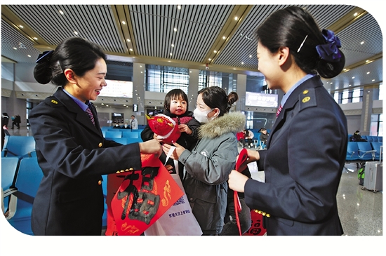 | 1月26日,沪宁沿江高铁武进站工作人员在为旅客发放春联和“福”字。 新华社发 史康 摄 |