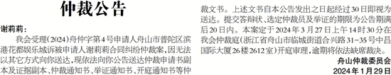 我会受理(2024)舟仲字第4号申请人舟山市普陀区滨港花都娱乐城诉被申请人谢莉莉合同纠纷仲裁案,因无法以其它方式向你送达,现依法向你公告送达仲裁申请书副本及证据副本、仲裁通知书、举证通知书、开庭通知书等仲裁文书。上述文书自本公告发出之日起经过30日即视为送达。提交答辩状、选定仲裁员及举证的期限为公告期满后20日内。本案定于2024年3月27日上午14时30分在我会仲裁庭(浙江省舟山市临城街道合兴路31-35号中昌国际大厦26楼2612室)开庭审理,逾期将依法缺席裁决。