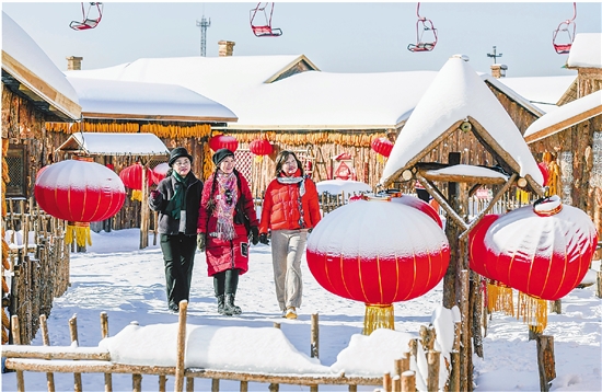 近日,游客在河北省遵化市山里各庄的山庄雪乡景区游玩。