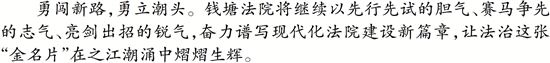 勇闯新路,勇立潮头。钱塘法院将继续以先行先试的胆气、赛马争先的志气、亮剑出招的锐气,奋力谱写现代化法院建设新篇章,让法治这张“金名片”在之江潮涌中熠熠生辉。