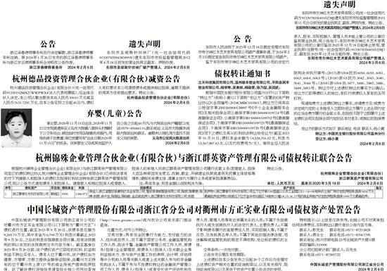 根据杭州锦殊企业管理合伙企业(有限合伙)与浙江群英资产管理有限公司签订的债权转让协议,杭州锦殊企业管理合伙企业(有限合伙)已将依法享有的对下列借款人和担保人的债权及担保权利依法转给浙江群英资产管理有限公司,现以公告方式通知债务人和担保人。请借款人和相应担保人或借款人、担保人的承继人向浙江群英资产管理有限公司履行还款义务(若借款人、担保人因各种原因发生更名、改制、歇业、吊销营业执照或者丧失民事主体资格等情形,请相关承债主体、清算主体代为履行义务或者承担清算责任)。