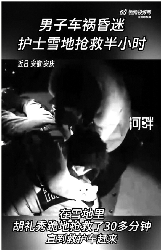 近日,安徽安庆。阜南县中医院护士胡礼秀回娘家路上发现车祸,一男子坐在车里面部发青、脉搏微弱,瞳孔也开始放大。胡礼秀和丈夫组织大家找来衣服等物品垫在地上,让男子平躺,胡礼秀立即对男子进行心肺复苏等急救措施。在雪地里,胡礼秀跪地抢救了30多分钟,直到救护车赶来。经医护人员确认,男子已恢复心跳,看到男子被救护车带走,夫妻俩才放心离开。