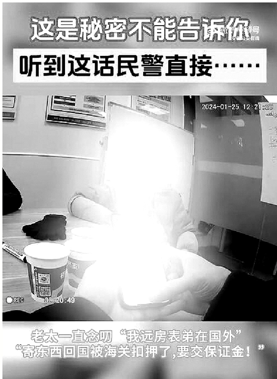 近日,安徽芜湖警方接到群众报警称有位八旬老太疑似被诈骗,经验丰富的老民警立刻出马劝阻转账。老太一直念叨“我远房表弟在国外,寄回的东西被海关扣押了,需要保证金”“他讲要保密,国家机密不能和人说!”。最终经过民警1个小时的耐心劝导,陪同观看反诈视频、剖析身边典型案例,成功保住了老人家的6.5万元。