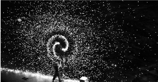 2月3日,在余姚市鹿亭乡中村村,民间艺人进行非遗打铁花表演。