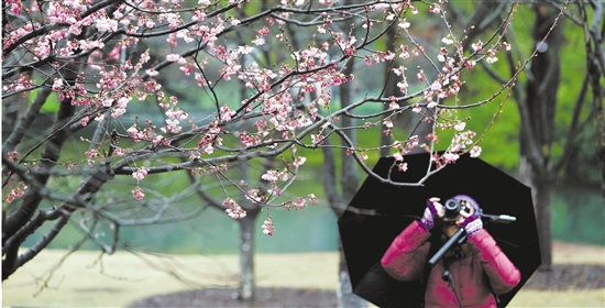 2月29日,杭州阴雨绵绵,太子湾公园不同品种的郁金香陆续“冒头”,几株染井吉野樱也绽放“繁花”,透露着春天即将到来的讯息。