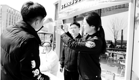 近日,临海市公安局杜桥派出所会同杜桥镇食安办、临海市市场监督管理局杜桥分局等单位,在街头开展“3·15”消费者维权普法宣传活动。图为杜桥派出所民警向群众传授识别假币的技巧。