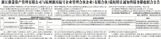 根据浙江浙萧资产管理有限公司与杭州浙珏陆号企业管理合伙企业(有限合伙)签署的《债权转让协议》(协议编号03ZX2022010-2、签署日期2022年12月31日),浙江浙萧资产管理有限公司已将其对下列借款人及其担保人项下享有的全部权利(包括但不限于主债权、担保债权、违约金债权、利息债权、损失赔偿权)依法转让给杭州浙珏陆号企业管理合伙企业(有限合伙)。浙江浙萧资产管理有限公司与杭州浙珏陆号企业管理合伙企业(有限合伙)联合公告通知各借款人及担保人以及其他相关各方。