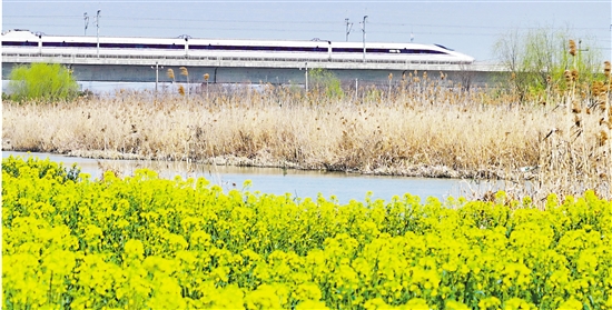 3月13日,长兴县吕山乡胥仓村,一列动车在金色的油菜花海中穿行,驶向生机盎然的春天。