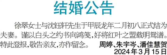 徐翠女士与沈钰轩先生于甲辰龙年二月初八正式结为夫妻。谨以白头之约书向鸿笺,好将红叶之盟载明鸳谱。特此登报,敬告亲友,亦作留念。 周婷、朱宇岑、潘佳慧贺