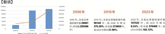 2023年,全省法律援助案件数107322件,较2016年增长8.24%;咨询数979465件,较2016年增长162.13%。