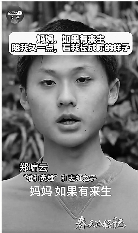 | 妈妈,如果有来生,请陪我久一点 @人民日报 (《人民日报》法人微博) “维和英雄”和志虹牺牲后,儿子郑啸云读她生前留给家人的信的视频,曾看哭无数网友。如今郑啸云已长成男子汉,他也决心和母亲一样做一名人民警察。“妈妈,如果有来生,你一定要陪我久一点……”致敬英雄! |