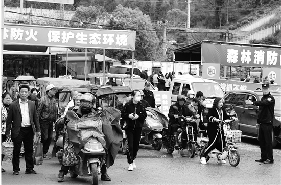 清明节期间,临海市公安局杜桥派出所全警出动,会同镇政府执勤人员,在28个点位开展清明森林防火及安全保卫工作,确保群众扫墓安全有序。图为民警在人流密集路口执勤。 通讯员 叶明銮 摄