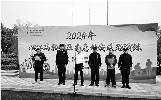 近日,杭州市滨江区浦沿街道高教园区应急处突反恐演练在浙江机电职业技术学院举行。区公安分局巡特警大队队员讲解了应急防暴器材使用方法,现场演示相关事件情况处置,并分组展开教学练习,进一步提高学校应对恐怖袭击和突发事件的处置能力。