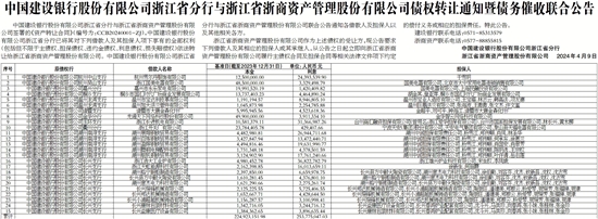 中国建设银行股份有限公司浙江省分行与浙江省浙商资产管理股份有限公司签署的《资产转让合同》(编号为:CCB20240001-ZJ),中国建设银行股份有限公司浙江省分行已将其对下列借款人及其担保人项下享有的全部权利(包括但不限于主债权、担保债权、违约金债权、利息债权、损失赔偿权)依法转让给浙江省浙商资产管理股份有限公司。中国建设银行股份有限公司浙江省分行与浙江省浙商资产管理股份有限公司联合公告通知各借款人及担保人以及其他相关各方。