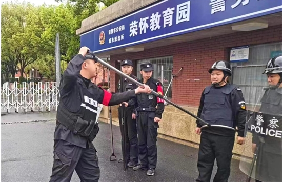 近日,诸暨市城东派出所民辅警到辖区荣怀学校开展校园防暴演练活动。民警向学校安保人员讲解了盾牌、钢叉和警棍等防暴器材的使用方法,并开展模拟演练,对存在的问题提出整改意见,进一步提高安保人员的防范意识。 通讯员 黄纯熠 蒋建飞