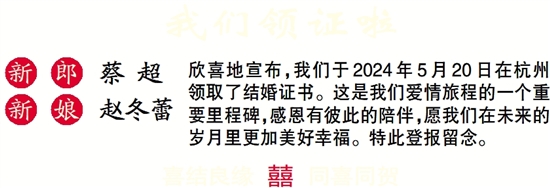 欣喜地宣布,我们于2024年5月20日在杭州领取了结婚证书。这是我们爱情旅程的一个重要里程碑,感恩有彼此的陪伴,愿我们在未来的岁月里更加美好幸福。特此登报留念。