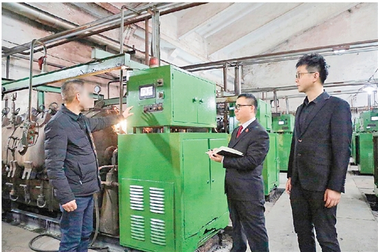 承办法官王彦刚(居中)与破产管理人(右一)了解企业近期生产经营情况