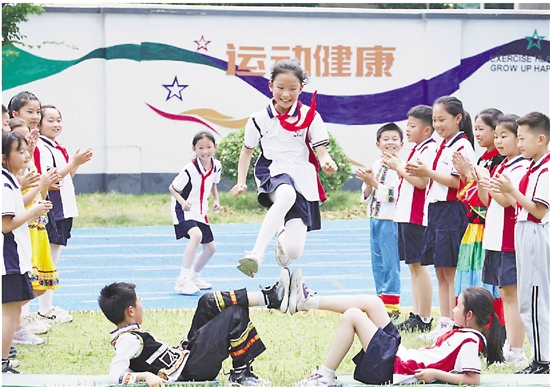 近日,在德清县乾元镇中心小学,同学们一起跳花盆、抖空竹、滚铁环等,乐享课间运动快乐。近年来,该校将优秀传统文化融入大课间,让同学们在运动中健康成长。