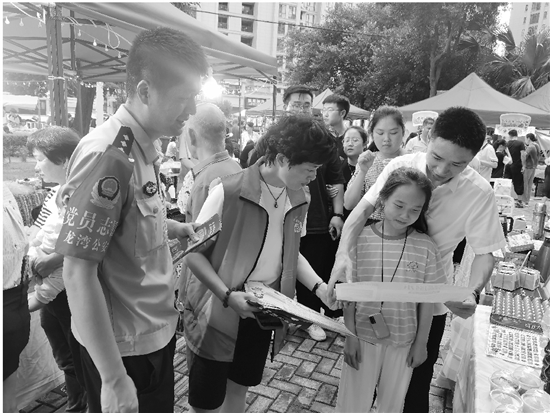 近日,温州市公安局龙湾区分局中心区派出所社区民警来到龙水社区“龙水集”,和集市上的摊主、顾客等进行面对面的交流,宣讲反诈骗、防溺水等知识。