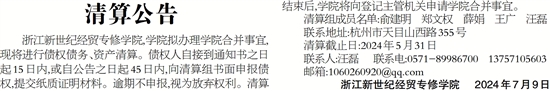 浙江新世纪经贸专修学院,学院拟办理学院合并事宜,现将进行债权债务、资产清算。债权人自接到通知书之日起15日内,或自公告之日起45日内,向清算组书面申报债权,提交纸质证明材料。逾期不申报,视为放弃权利。清算结束后,学院将向登记主管机关申请学院合并事宜。
