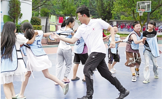 7月9日,浙江大学、金华职业技术学院的大学生志愿者在武义县南部山区的新宅镇中心小学辅导“小候鸟”学习,并一起开心玩耍。为解决外来务工人员暑假期间子女看护难,武义县在外来务工人员较集中的企业、学校、社区开办暑期公益托管班。大学生志愿者为小朋友辅导作业、安排文体活动、进行安全教育,既让家长安心务工,又使“小候鸟”在异地他乡度过快乐、安全的暑假。