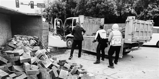 近日,在台州市椒江区台州大道与东平路交叉口,一辆货车转弯时由于车速过快导致侧翻,车上装载的灰砖掉落路面,占据了大半个车道。台州市公安局交通警察局直属一大队交警正好巡逻至此,立即化身“搬砖工”,和司机以及热心路人一起,将灰砖搬运到另外一辆货车上,及时消除交通安全隐患。