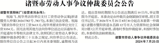 祝海飞、祝华秀诉你单位支付工资劳动争议案[浙诸暨劳人仲案(2024)782号、783号],本委已依法受理。祝海飞要求你单位支付工资5613元;祝华秀要求你单位支付工资5334元。因无法用其他方法向你单位送达应诉通知书、开庭通知书等相关法律文书,依照《浙江省劳动人事争议调解仲裁条例》第三十五条之规定,向你单位公告送达。限你单位自公告之日起30日内来本委领取,逾期视为送达。提出答辩的期限为公告送达期满后10日内,举证期限为开庭前。本委决定由仲裁员金晓颖独任审理,胡王菲任书记员,于2024年9月25日8时30分起在本委第一仲裁庭(诸暨市暨阳街道永昌路12号市人力资源和社会保障局2楼)公开开庭审理,请准时参加仲裁庭审,未按时参加的,本委将依法缺席裁决。