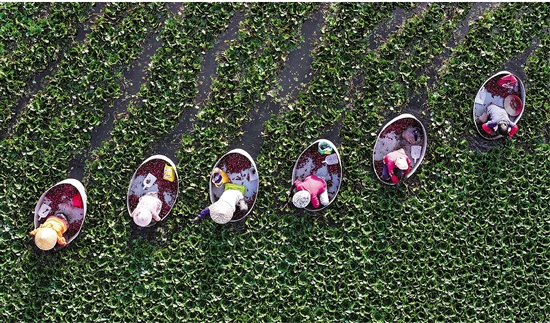 近年来,江苏省淮安市洪泽区岔河镇利用生态水域种植菱角,大力发展特色产业,助力农民增收致富。