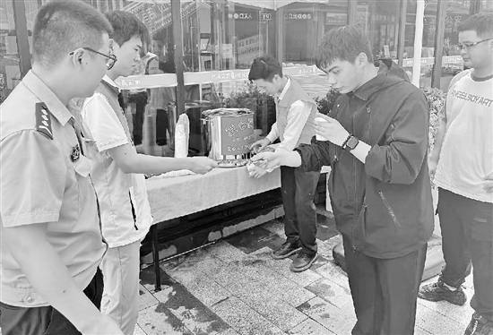 夏日炎炎,温州市公安局龙湾区分局蒲州派出所吾悦广场智慧警务站联合义警,为过往行人提供凉茶,还不忘在杯子上粘贴反诈标语。