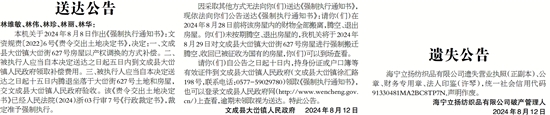 因采取其他方式无法向你(们)送达《强制执行通知书》,现依法向你们公告送达《强制执行通知书》:请你(们)在2024年8月28日前将该房屋内的财物全部搬离,腾空、退出房屋。你(们)未按期腾空、退出房屋的,我机关将于2024年8月29日对文成县大峃镇大峃街627号房屋进行强制搬迁腾空、收回已被征收为国有的房屋,你(们)可以到场查看。
