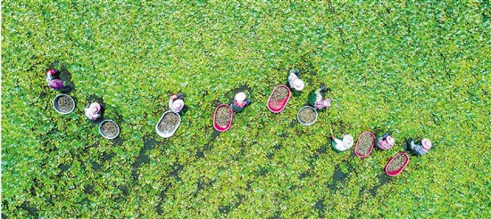 8月22日,温岭市箬横镇双透村农民在采摘菱角(无人机照片)。