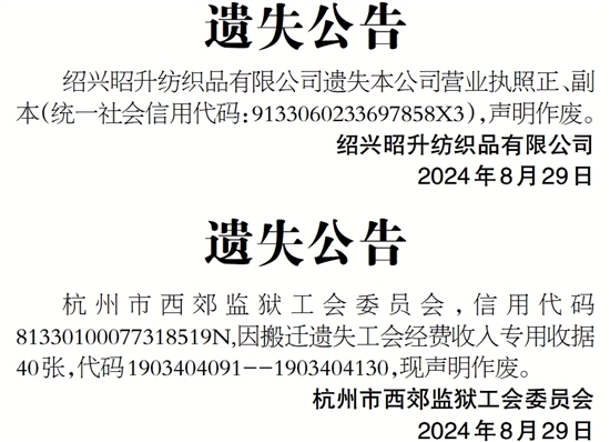 绍兴昭升纺织品有限公司遗失本公司营业执照正、副本(统一社会信用代码:9133060233697858X3),声明作废。