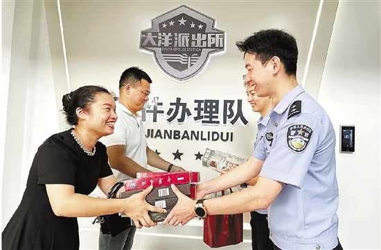 近日,临海市民周先生夫妇高兴地从大洋派出所领回被盗烟酒。不久前,周先生报警称店里的五粮液、中华等名贵烟酒被盗,损失达3万余元。大洋派出所迅速启动小案快侦机制,不到10小时就在宁波抓获两名盗窃嫌疑人。 通讯员 杨灵叶