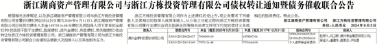 根据相关法律规定,以及浙江湖商资产管理有限公司与浙江方栋投资管理有限公司签署的《债权转让协议》(日期为2020年6月11日),浙江湖商资产管理有限公司已将其对债务人本金14975116.48元债权及其担保人项下享有的全部权利(包括但不限于主债权、担保债权、违约金债权、利息债权、损失赔偿权)依法转让给浙江方栋投资管理有限公司。浙江湖商资产管理有限公司与浙江方栋投资管理有限公司联合公告通知各借款人及担保人以及其他相关各方。