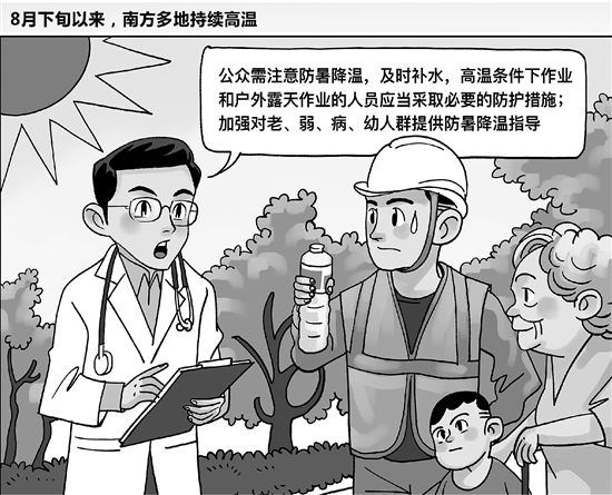 | 8月下旬以来,南方多地持续高温,四川、湖北、湖南、江西等地多个市、县最高气温突破月极值。中央气象台9月3日继续发布高温黄色预警。 专家建议,公众需注意防暑降温,及时补水,尽量避免午后气温较高时段出行;高温条件下作业和户外露天作业的人员应当采取必要的防护措施;加强对老、弱、病、幼人群提供防暑降温指导。 新华社 德德德 作 |