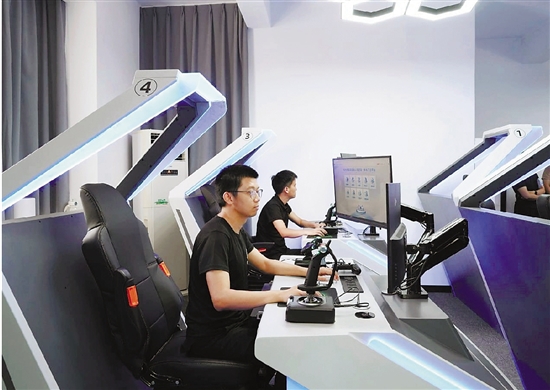 临安公安低空警务作战中心大概80余平方米,有10名飞手和一名接处警的民警,巡(特)警大队副大队长陈鹏飞是这里的负责人。记者现场看到,每位飞手的驾驶舱会发出紫、绿、红三种颜色,代表无人机的不同飞行状态。工位上有两个飞控摇杆,飞手左手控制无人机油门,右手控制方向,眼前的电子大屏实时播放无人机传来的画面。