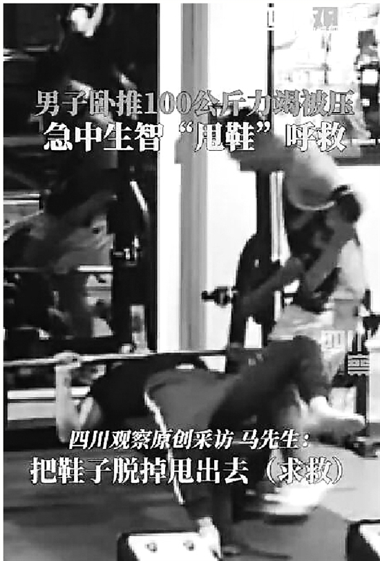近日,四川南充,一男子卧推100公斤力竭被压,危急时刻男子甩鞋求救。当事人马先生回应:幸好没有受伤。提醒:健身锻炼需量力而行。