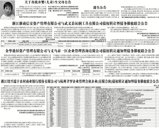 武义县沁润工具有限公司作为上述债权的受让方,现公告要求公告清单中所列包括但不限于债务人、担保人及其清算业务人等其他相关当事人,从公告之日起立即向武义县沁润工具有限公司履行主债权合同及担保合同约定的还本付息义务或相应的担保责任(若借款人、担保人因各种原因发生更名、改制、歇业、吊销营业执照或丧失民事主体资格等情形,请相关承债主体、清算主体代为履行义务或承担清算责任)。特此公告。