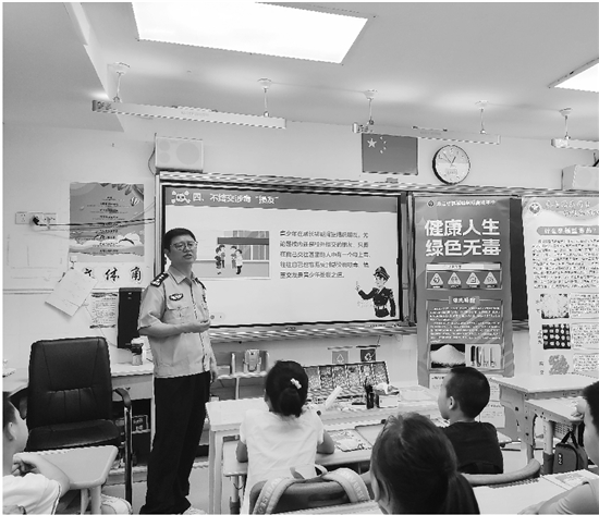 近日,杭州市拱墅区天水街道禁毒办在长寿桥小学开展禁毒流动课堂活动。现场,浙江省拱宸强制隔离戒毒所民警向学生们讲解了毒品的危害,禁毒社工向学生们展示了仿真毒品,增强学生们的防毒意识,营造良好的禁毒氛围。 通讯员 钱航 摄