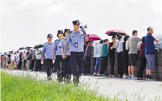 海宁市公安局巡特警大队民警董洛羽是土生土长的海宁人,“以前都是作为游客来盐官观潮,今年第一次作为民警参与观潮安保,虽然背对着潮水,但心里非常自豪。”他说,“执勤要求是面对游客、背对潮水,因为我们的任务是保证群众安全观潮。”
