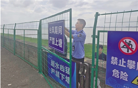 “师傅,台风很快要来了,沿江景区已经关闭,海塘边非常危险,请你们赶快有序离开,台风过了再来观潮!”“谢谢警察同志!我们之前不知道这些情况,我们这就回去……”海塘沿线,沿江派出所和连杭治安队采用“人巡+车巡+摩巡”的方式动态巡防,并通过高音喇叭喊话等形式,劝离前来观潮的游客,还对通向海塘的各条小路拉起警戒线,进行临时性封闭,以确保万无一失。